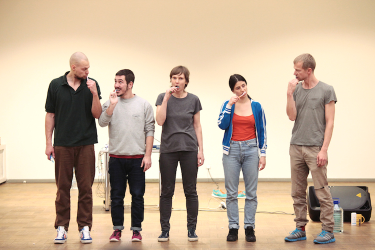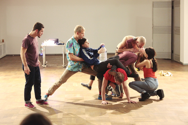 A group of people tries very hard to master a situation. And she is asking for assistance. An invisible and shared “will” keeps them together. Desire is constantly destroyed. And she is oncemore asking for assistance. The group keeps on tasting togetherness. Playfulness, repetition and ongoingess seems to be their leitmotiv.